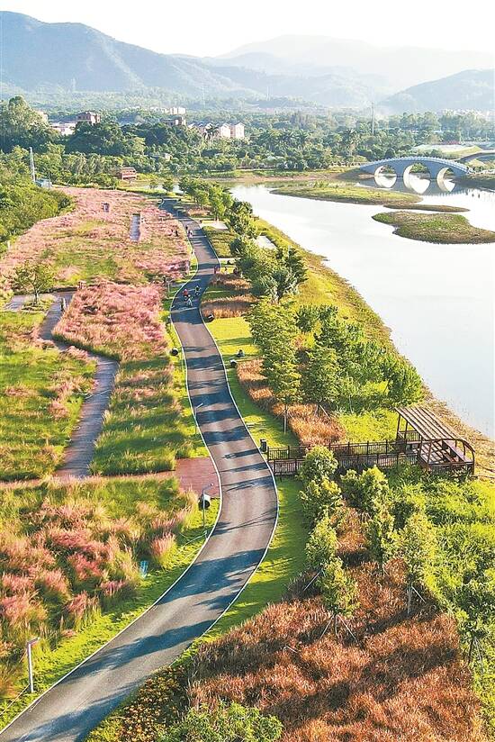 这片7000平方米粉黛花海所在的新大禾塘湿地公园,是大鹏新区“禾塘三部曲”中面积最大、生态环境最好的湿地,占地面积15万平方米,是以自然生态恢复为主的公园。园区内主要有粉黛花田、观鸟亭、卵石海滩、碧道驿站、跨河古桥等景点。走进园内,石桥流水、蜿蜒曲径、绿草如茵,湿地内还生长了20000平方米的红树,可零距离接触、观察、研究红树自然生长过程。