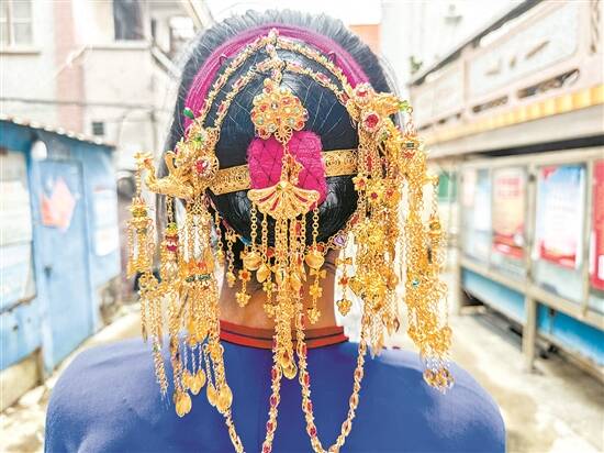 “假发髻最重要的是发髻的模型大小,大一厘不行,小一丝也不行。更难的是,要确定底部铁丝圈的大小。”苏一妹边拿出铁丝圈边用铁钳作出示范。她告诉记者,假发髻的框架由铁丝固定形成,需先用铁钳将铁丝绞出几个椭圆形,再将几个椭圆形一侧进行铁丝固定,搭出发髻的基本架构,宛如一个帽子形态,继而用细的铁丝从下至上缠绕固定住椭圆形架构,并在底部粘上一圈假发辫,以防套发时勾住真发。到这里,也只是制作假发髻的第一步。接下来,要将近两米的假发用红绳几番缠绕在架构上。“这是一个细活儿。”苏一妹解释道,用红绳固定缠绕的假发会凹凸不平,只能屡次抚平假发凹凸处,辅以一圈圈掩盖,力道、技巧缺一不可,最后用网兜将整个架构套住,一个假发髻便制作完成。