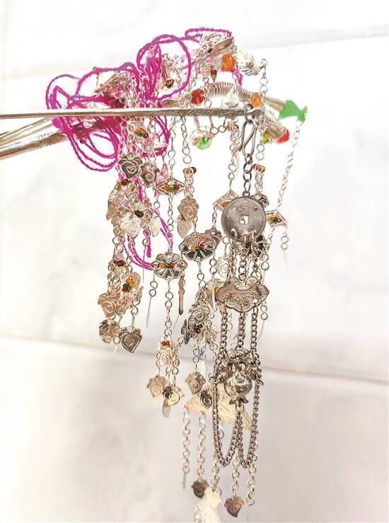说起对发簪的创新和改动,苏送梅乐道,这都是喜爱惹的“祸”。起初,她见以前的簪子款式过于单调,便尝试在传统样式基础上进行了些许改动,没想到大家都很认可改动后的样式,这让她继续燃起了设计、制作发簪的热情,并坚持了数十年。如传统的雀仔簪,簪子上雕刻了鱼的样式及花草纹路,鱼嘴上镶嵌着玉石做的鸟雀形象,简单大方,已十分精美。苏送梅则在此基础上增加了抖动的弹簧圈、多条短链条,她将新式的剔透鸟雀嵌在弹簧圈上,稍微走动,鸟雀便在发间上下飞跃,链条则加上贝壳、鱼、虾、铜钱、幸运草等好寓意的小饰品,如流苏一般在一侧垂坠,整体改动后的雀仔簪更为精巧灵动,富有生机,让人看了爱不释手。