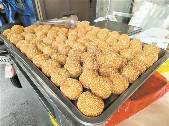金星炸品的负责人陈霞英正在油锅前忙碌,油花欢快地跳跃着,发出“吱吱”的声响,将一个个混合着南瓜丝、生姜丝和糯米粉的南瓜圆炸至金黄捞出,香气扑鼻、非常诱人。
