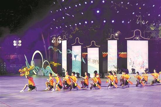 当街舞与狮子操碰撞,会擦出怎样的火花?舞蹈《狮舞少年》登场时,民乐小学的少年们以灵动的舞姿,演绎着狮子的威猛与街舞的酷炫,展示出的活力赢得观众的阵阵掌声。其领队老师陈军告诉记者,当晚参演的小演员们来自学校的小飞鸿国术团,该社团主要课程为醒狮、武术,也将音乐、舞蹈与醒狮、武术相结合,创编“一年一原创舞剧、一年一原创歌曲”,传扬乡土文化,传承本土人文精神。