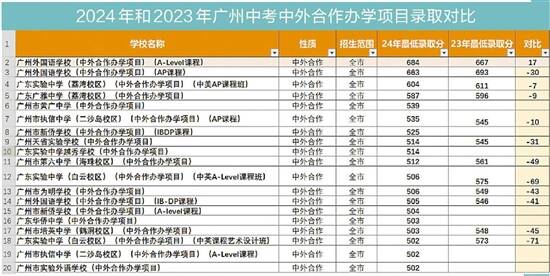 今年是公办、民办高中国际部(中外合作办学)纳入中考平台的第二年,广州市招考办表示,中外合作办学项目的录取最低分数比2023年普遍下降。其中约12个中外合作办学项目中,只有一个录取分数提高17分,其他项目录取分数均降低。降分幅度最小的7分,最多的降了71分。
