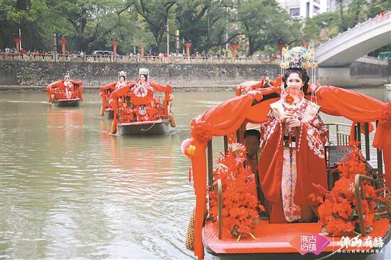 金秋时节的汾江河,碧波荡漾,河畔一树树繁花绽放。水面之上,雅致又喜庆的船只顺流而下,船上载着身着“凤冠霞帔”的新娘,岸边站着等候多时的新郎。喜船抵达正埠码头后,新郎用一条红绸将新娘牵上岸送入花轿,在欢乐的锣鼓声中,花轿沿古道穿梭前行,先后经过琼花会馆、忠义乡牌坊、永安路、国瑞汾宁古道、富民路、松风路等历史街区,最后到达梁园。