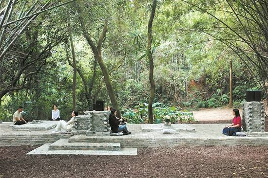 在南海西樵山上,一片茂盛竹林中有一个专属于聆听的开放性创作——《听山》,这是艺术家朱哲琴为第二届南海大地艺术节创作的户外大型声音互动装置。当记者走进这个回归于“听”的艺术作品,看到许多观众来到这片无形的声场中,或坐下或躺卧或游走,又或敲击现场布置的磬,让声音与波的能量交汇,在这里体验一次与自己感知的深度对话。