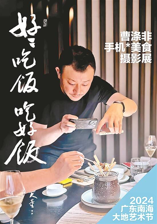 带着这个观点,从2022年起,曹涤非跟随“大地艺术节”走进南海。在首届南海大地艺术节里,他与广州跃系列餐厅创始人Chef Seven(陈晓东)共同主理设计开幕晚宴,用本地食材和西餐摆盘,呈现出一席中西合璧的特别晚宴。而在本届大地艺术节上,曹涤非以《好好吃饭——曹涤非手机美食摄影展》为题,共展出图片作品238张,包括菜品与餐饮人两个类别,还有《食空1》《食空2》和与著名旅法艺术家范一夫先生合作的《眼见为食》三件装置作品。当年与Chef Seven(陈晓东)合作晚宴的幕后花絮也首次以纪录片的形式在本次展览上和大家见面,通过互动软件,可以让观众现场生成由美食组成的个人专属纪念海报。