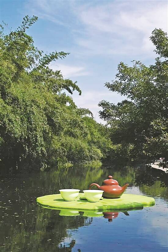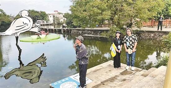 结合当地人的生活习惯,tango忽然对每天鹭鸟的奔袭有了点想法。“听村民说,鹭鸟一般是不吃旁边池塘的鱼的,每天要到其他地方捕食。于是我想,相伴相依这么多年,什么时候鹭鸟能和当地人一样,早上悠闲地拿起茶杯,品品茶?”AR作品《茶之鹭》的灵感就这样诞生了。tango在竹林边上搭起了一个直径6.5米的荷叶,上面放着茶壶一盅、茶杯两只,乍一看平平无奇,但如果游客一扫池塘边的二维码,手机上立刻会“跳”出一只白鹭,站在池水上,“手”持茶杯在喝茶。视频播放时,游客还可以同步合影,“游客远观白鹭喝茶”的场景,让不少游客感觉十分新鲜。