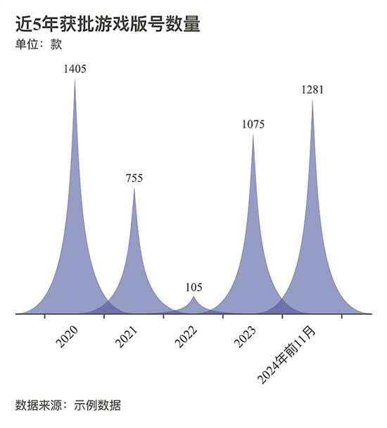 而从数量上看,截至今年11月,2024年发放游戏版号共1281款,其中,国产网络游戏版号已达1184款,进口97款,数量上远超过去4年的平均水平,也超过了2023年全年的1075款。与2023年同期相比,国产游戏获批数量为977款,进口游戏为98款,显示出今年游戏版号发放的稳定态势。如果算上接下来的12月,预计2024年游戏版号发放将创近5年新高。