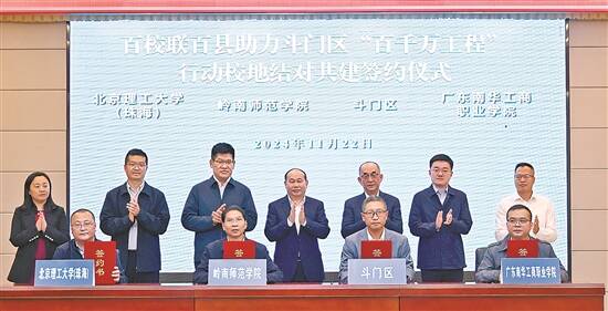 产业发展科技支撑、城乡规划建设服务、基本公共服务、基层人才培养培训、集体经济运营、基层改革创新探索、决策咨询服务……近日,百校联百县助力珠海市斗门区“百千万工程”行动校地结对共建座谈会召开。斗门与北京理工大学(珠海)、广东南华工商职业学院和岭南师范学院三所高校签订协议,成为结对共建单位,深入推动校县结对、合作共建,助力高质量发展。