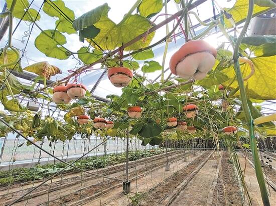 在大棚瓜类展示区记者了解到,展示区面积约4亩,种植瓜类品种37个,全部采用无土栽培水肥一体化栽培技术。甜瓜、苦瓜、丝瓜、南瓜等各式瓜类品种琳琅满目,瓜类不仅采摘时间较长,而且颜色丰富、种类多样、造型独特,非常适合东莞农业休闲观光采摘的推广应用。这里还配套展示了“茄子树”、盆栽蔬果等,具有很高的观赏性和趣味性。