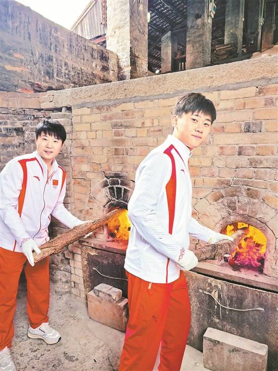 两位冠军在南风古灶“添柴加薪”