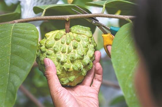现场,果农们手持剪刀,穿梭在果园间,手法娴熟地采摘着成熟的果实,一派忙碌的丰收景象。“现在采摘的是今年首批上市的释迦果,它的表皮有一颗颗凸起的小点,呈滴水状,特别漂亮,是市场的抢手货。”农场负责人陈盈宇随手摘下一个大大的释迦果说道。