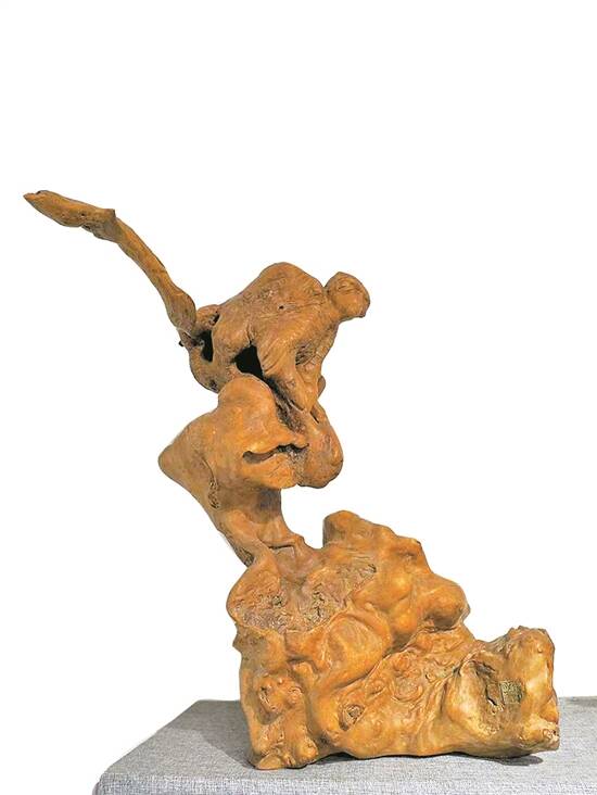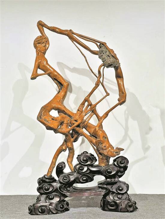 根雕艺术形成已久,有“三分人工,七分天成”的说法。根雕艺术是自然与人力相结合,有奇、巧、朴的特点,又有与器物或者艺术相搭配、衬托的融合。因此,王增丰得到一份质地好、形状独特的树根,往往要反反复复观察十几天才动手开始雕刻。“形态各异的树根有了,接下来就是考验创作者的想象力,不能随意动刀,要尽量保留原汁原味的形态。”追求原本、真实、自然的状态,不露痕迹地加以艺术创作是王增丰对待根雕艺术的态度。
