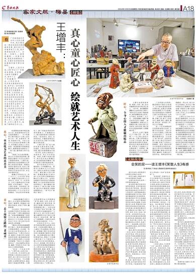 王增丰,人民艺术家,1947年生于广东梅县松源镇,自幼随父亲学习根雕艺术,创作了上千件根雕作品,上世纪90年代末转向漫塑研究实践,创作出一系列颇具影响力的作品,获得中国民间艺术最高奖——山花奖,以及国家、省、市级金银奖50多项。他还是享受国务院特殊津贴专家、文化部艺术中心中国民间艺术品评估鉴定委员会委员、中国雕刻艺术大师、广东省人民政府文史研究馆馆员、广东省工艺美术大师。从军旅生涯到金融界沉浮,从青葱岁月到年逾古稀,王增丰以真心对人、以童心看世界、以匠心筑艺术,绘就了独特的艺术人生。