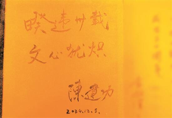 时隔30年,陈建功再次到访东莞,他感叹着东莞的巨变和发展,也对东莞为文艺创作者提供良好环境赞叹不已。“30年前东莞市作家协会刚刚成立,一晃30年过去了。”12月9日,在东莞文联文艺空间举行的2024年“东莞文艺论见”重点题材创作辅导会后,陈建功再次把自己的名字签到30年前的作家题名录上,并写上“暌违卅载,文心犹炽”。与此同时,他为东莞文联题赠“暖心之家”,点赞东莞文联为文艺创作者提供良好的发展环境。