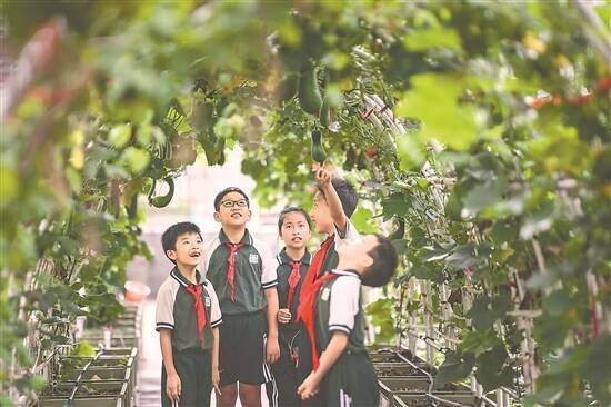作为“广东省中小学劳动教育特色学校”,回民小学打造了“劳动+全学科”特色课程。在回小的天台上,有一座亲近自然的“空中花园”,也成为了学校劳动教育的重要实践基地。以种植为例,中高年级的孩子在老师的带领下每班承包一块菜地,完成催芽、插秧到收获完整的劳动成果,种稻不发芽,就请科学老师带着大家研究水稻发芽原理,插秧需要计算面积,就请数学老师“出山”,规划尺寸,设计合理的育秧间距,茁壮成长的植物吸引了鸟儿的光顾,美术老师就亲自上阵带领孩子们把眼前的景色画下来,还请科技老师一起制作“驱鸟器”,这便是回小以劳动项目为载体,驱动跨学科、项目式学习的丰硕成果。