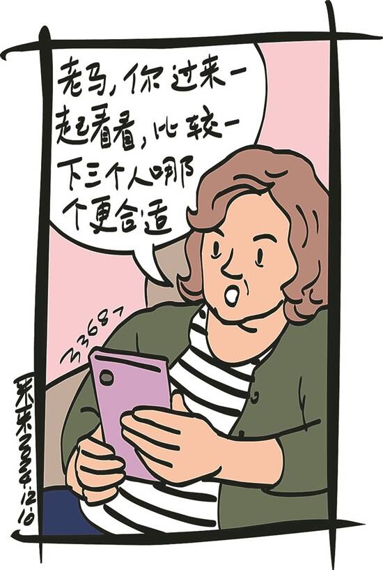 这天,刘阿姨的表姐给她打来电话,还一次性发了三个相亲对象的照片,一个叫小李,一个叫小王,还有一个叫小孙。刘阿姨收到三个小伙的照片后,连忙将丈夫老马喊过来一起看,比较一下三人哪个更合适,好让甜甜跟对方见面相亲。