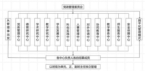 回民小学创新管理,在党组织领导的校长负责制引领下,改为12个中心负责学校事务,中心负责人直接对接四位校级领导组成的党政管理委员会,教师自愿报名参与中心工作,12位中心负责人分2人一组与级长共同主管年级事务,学校管理从过去的层级化管理到如今的扁平化管理。