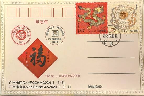 每个春季学期开学第一天,孩子们都会收到学校的礼物——一张明信片。正面是当年科艺节中绘画比赛头名的作品,反面是书法比赛头名学生写的“福”字,每张明信片上都会有一枚当年生肖邮票,并盖上大年初一的邮戳。
