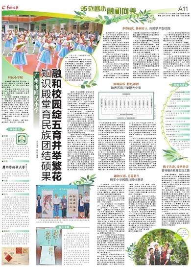 走进回小,扑面而来的是浓浓的民族气息。南北校区里的砂岩主题墙、“民族大团结”长廊、各教学楼的走廊、楼梯、柱子上都有图文并茂的民族知识、民族团结的宣传画,凸现鲜明的融和教育特色。此外,南北校区还设“融园”“和园”“心园”“趣园”“乐园”“阅园”;图书馆、校史馆、中医药劳动实践与广府文化传承创新科普馆与盛世流芳艺术馆等6园4馆的非正式学习空间,从装饰、环境布置上体现中华民族一家亲的意识。