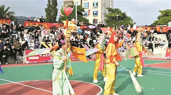 篮球比赛期间,现场穿插具有地方特色的非遗表演,如舞鲤鱼、渔歌等