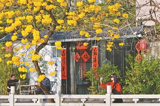 惠州菱湖边上的黄花风铃木金灿灿,游客市民驻足拍照 吴伟荣 摄