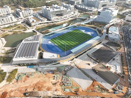 学生体育中心组团北侧的室内体育馆(2号体育馆)是深圳市建筑工务署首个近零碳排放试点体育建筑。光伏与建筑结构进行一体化设计,建筑采用“自发自用、即发即用、散发散用”的光伏供电系统,不接入市政电网。建筑屋面设置692块单晶组件,总面积约1787.61平方米,预计年发电量约45.79万千瓦时,其光伏发电量远大于建筑本体耗电量,所产生的电量主要供应本栋楼、附近其他楼栋及运动场,为体育组团提供充足的绿色能源。