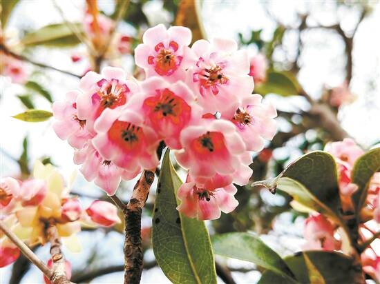 如今这片花林已扩大至上千亩,约有上万棵。千亩花林中,金钟花喜气盈盈地绽放,每一朵都如同指头般大小,呈优雅的钟状,花瓣为五裂瓣,外缘轻轻外卷,宛如大自然精心雕琢的杰作。它们或粉或红,如一盏盏精致的小灯笼在微风中摇曳。