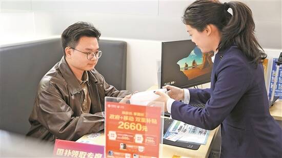羊城晚报讯 记者潘亮摄影报道:新年换新机,占得好先机。1月20日0时,国家补贴上线实施,消费者购买手机、平板电脑和智能手表等数码产品都可以享受补贴。广东移动东莞东城移动广场营业厅售出了全国第一台享受购新补贴政策的手机。