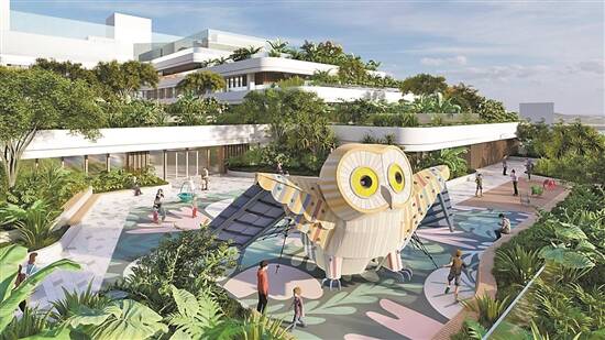 据介绍,该项目整体引入绿色设计理念,通过建筑再现“山丘”“公园”等元素,配合儿童卡通立面和绿植波浪式屋顶,削弱建筑的体量感和对城市道路造成的压迫感,与自然山体及周边建筑形成良好的城市天际线,为患儿创造了一个平静和治愈的“绿洲”。室内设计则以森林为灵感,进入建筑后仿佛置身于大自然中。