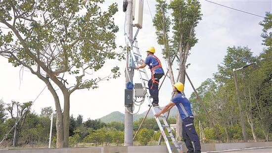工作人员查看村内电信设施布置情况