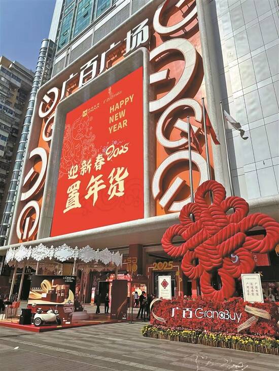 广百也聚焦首个“非遗春节”打造极具传统特色的文化体验活动。在广百北京路店,新春装置以中国如意结为文旅钥匙,“行花街、逛广百”,顾客置办年货之余就能感受各种非遗活动。在环市东商圈,广州友谊举办的“花漾年货节”,“喜巳迎春灯笼阵”即将闪亮登场,寓意红红火火庆新年。