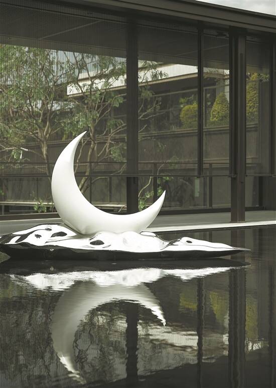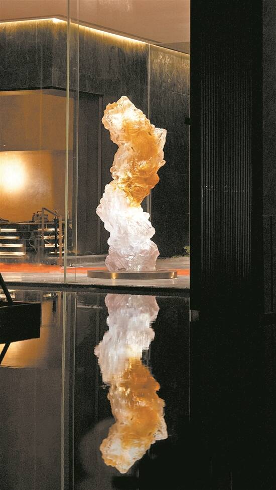 从正门进入连廊,在200平方米的水庭之上,坐落着基于四川雅安独有石材、大师定制级汉白玉玄月雕塑,并以约11米高玻璃盒子+金属格栅,与玄月雕塑相呼应,打造“镜湖月影”画面。