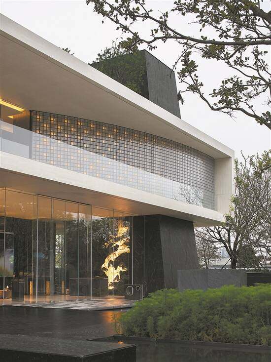 “大隐隐于市”是该项目售楼部给人的第一印象,置身繁华喧嚣的长隆万博片区,很难想象一个转身就会看到一处安静如雕塑的生活美学馆。建筑整体用凝练的白色直线条呈现,通过门前的一片青黑水景呼应,在日光的照射下,波光粼粼的墙面瞬间将沉寂的售楼部变得灵动起来,不禁让人萌生一探究竟的想法。