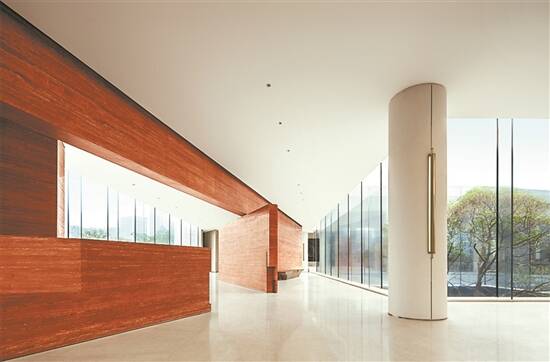 迈入二楼,映入眼帘的又是另一番艺术胜景。整体空间通过大面积红洞石的运用,将这种具有丰富纹理的材质嵌入建筑。设计师选择挑选中东地区的红洞石,一定程度也呼应了广府兼容开放的城市气质。透过二楼的落地窗,室内空间与室外景观交织融合,让人们在享受现代设施的同时,也能感受到自然与宁静的和谐共存。