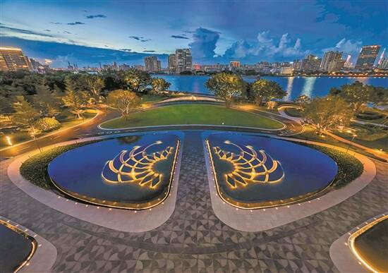 汉白玉玄月雕塑所在的“镜湖月影”景观