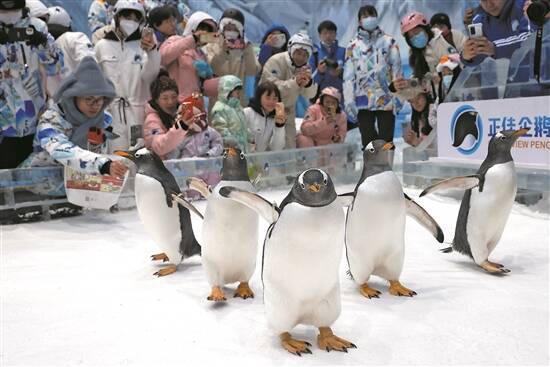 正佳广场里憨态可拘的企鹅与游客亲切互动