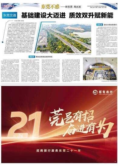 4月21日,常虎高速改扩建工程首条隧道贯通,项目取得了突破性进展,离全线通车向前迈进了一大步;3月23日,莞深高速改扩建工程东深公路跨线桥右幅旧桥顺利拆除,且高效完成了交通导改,项目再次取得关键进展。今年以来,东莞多项交通基础设施建设火力全开,高效推进,涉及交通枢纽建设、城市内部交通优化、区域协同发展等多个方面,进一步畅通城市发展脉络,为高质量发展注入强大动力。最新统计数据显示,今年一季度,东莞交通基础设施建设投资完成55亿元,比2024年同期的51.9亿元增长约6%,全面完成一季度的投资目标。