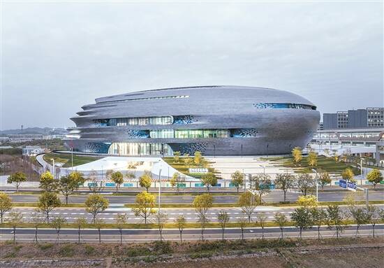 “建筑外表皮由95888块不同形态的不锈钢面板组成,包括平板、单曲面、双曲面等形式。项目围绕不锈钢着色工艺的色彩稳定性、色差可控性等开展了长达三年的研究,实现了建筑外墙不锈钢面板从‘星云蓝’到‘幻影灰’渐变过渡,不同的颜色纹理在阳光和空气的折射作用下,呈现出金属质感,践行了‘建筑即展项’的建设理念。”