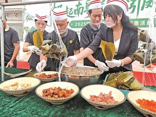 锣鼓声中,一条金色长龙腾空而起,在人群的欢呼声中翻腾游走;身着彩衣的畲族姑娘们踏着欢快的鼓点翩然起舞,银饰叮当作响,裙摆飞扬如花。最引人注目的是粽子制作区,师傅们正娴熟地将饱满的鲍鱼、金黄的五花肉裹进翠绿的粽叶,手指翻飞间,一个个棱角分明的鲍鱼粽已然成型,空气中飘散着竹叶与海鲜交融的诱人香气。