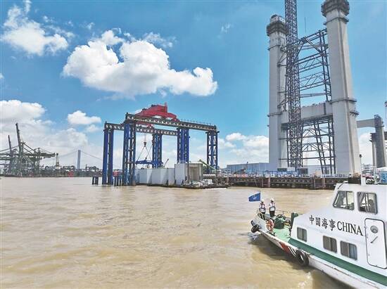 为保障吊装作业安全顺利进行,东莞海事部门提前介入,及时开辟绿色通道,优先保障载运钢壳构件船舶运输畅通,确保项目建设高质高效。多次召开吊装作业前安全宣贯会,实施“一船一策”服务举措,指导施工方编制通航安全保障方案,提出海事安全帮扶建议。同时,组织业务骨干深入现场开展风险隐患排查整治安全业务帮扶,及时解决施工过程中出现的问题,叮嘱企业落实好安全生产主体责任,做好吊装前各项设施设备检查,对施工危险性较高、容易发生事故的重点环节和岗位落实专人负责制。在吊装作业期间,海事部门强化综合立体管控,通过智慧海事远程盯防、无人机空中巡航、海巡船现场警戒等巡查模式,全方位监控作业现场和周边水域动态。建立信息共享共治机制,加强与船方、施工方、气象等部门的沟通协调,及时掌握天气、海况变化,抢抓吊装作业窗口期,东莞沙田海事处西大坦海巡执法大队负责人洪新介绍说。