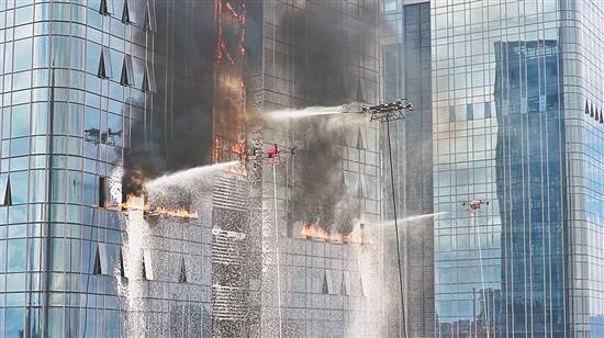 破解通信难题。超高层建筑垂直跨度大、内部通信环境复杂,现场救援力量使用系留无人机搭建空中基站,确保楼宇“信号满格”,智能装备战力不减。