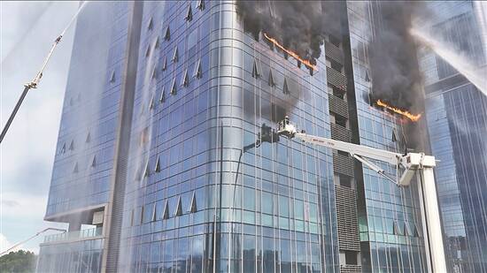 “高温烟气通过电缆井管道迅速向上蔓延,并引燃25楼装修材料,火势进一步扩大!”内攻消防队员接报后,快速灌注泡沫对着火层电缆桥架灭火降温,并利用阻火包、防火泥等新型材料对着火层的上下楼层电缆桥架实施封堵,多重阻断、防止复燃,有效阻止了火势通过竖井蔓延。