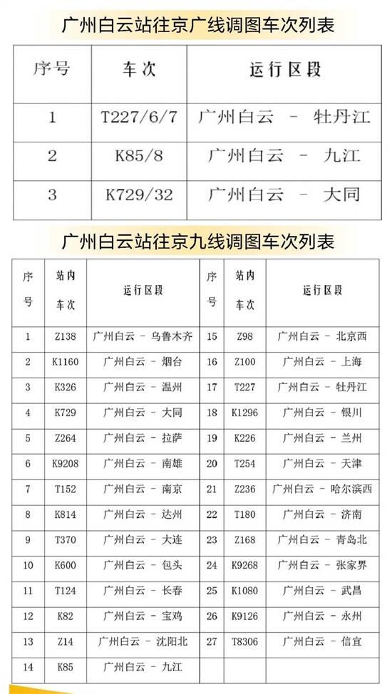 其中,广州站往京广线始发终到27对普速列车全部调整至广州白云站;广州站往京九线始发终到3对普速列车,调整至广州白云站。