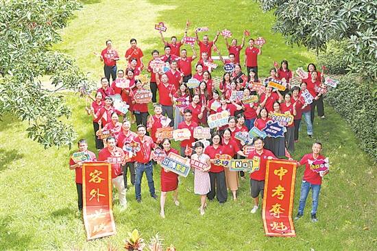 “加油!金榜题名!”在语文学科开考前,惠景中学老师们身穿红色送考服,拿着向日葵寓意“一举夺魁”给少年们加油,惠景学子们信心满满有序进入考场。