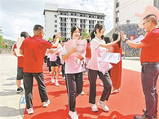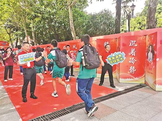 此时,佛山三中初中部本校考生也陆续有序进场。“全力以赴,加油!”佛山三中学子在进入考场前穿过一片红色喜庆的连廊,送考老师们在连廊两侧与奔赴考场的每一位学生击掌,“加油”声此起彼伏。“今年我们为每一个参加考试的班级都设了一个准备室,让学生到准备室好好休整,老师们提前到场,现场给考生发准考证,现场清点每一位考生的考试用品,每个班级都准备了5套备用文具,以备不时之需。”佛山三中初中部负责教学业务的副校长刘平告诉记者,老师也会下沉到准备室,随时解答学生的疑问,并给学生打气。