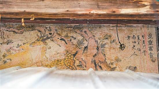 “壁画所描绘内容带有明确的意象,不是胡乱所作。”刘汉新告诉记者,壁画上描绘的动植物皆带有吉祥寓意的谐音,如蝙蝠、鹿可作“福禄寿”;喜鹊和梅花枝桠可作“喜上眉梢”;花朵可作“花开富贵”;石榴可作“多子多福”等。“过往一些人家对孩童抱有学业有成、来日高中的美好心愿,壁画上便会出现鱼跃龙门、文昌笔、书籍等内容。”