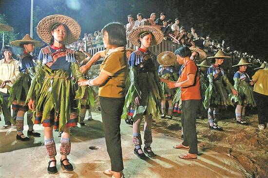 “‘舞火狗’要穿树叶衣裙也是有讲究的。”林何娣说,以前条件有限,只能采黄姜叶来做衣裙,现在扮火狗仍然要穿树叶衣,是为了不忘祖先经历的艰辛岁月。