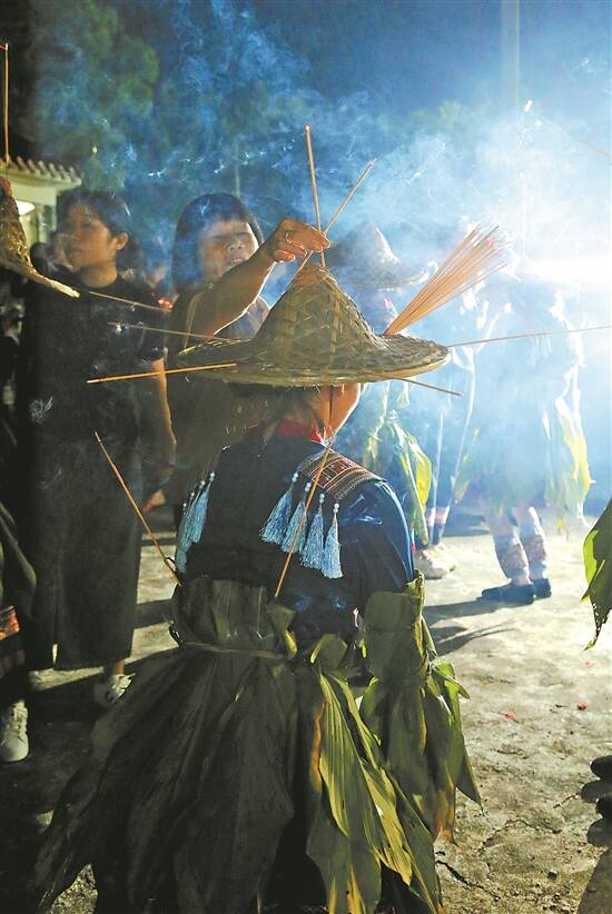 少女身披黄姜叶,头戴竹笠,全身插满香火 刘学聪 摄