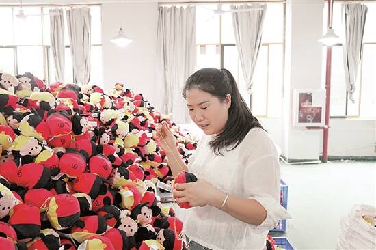 走进公司车缝车间,100多名工人正埋首操作平车,手中的布料迅速变成玩具半成品。经过冲棉、挑形、整形、检验等多道工序,一只只造型可爱的“三代星星人”毛绒玩具陆续下线,即将发往国内外市场。