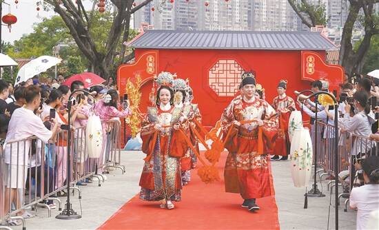 今年国庆节的学宫广场,红绸飘扬,鼓乐齐鸣。15对新人正在这里举行一场别开生面的集体婚礼。新人们依次行沃盥礼、对拜礼、同牢礼、合卺礼、结发礼、执手礼等传统礼仪,以文明简约而庄重的仪式步入婚姻殿堂。在场亲友和市民共同见证了这一幸福时刻,现场洋溢着温馨浪漫的气氛。